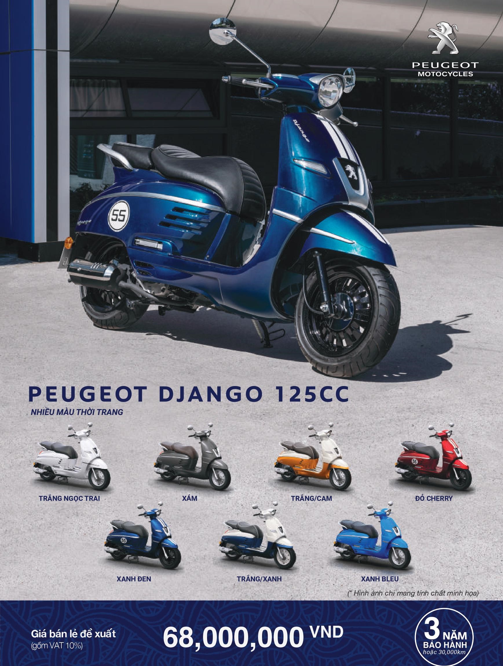 Mẫu xe tay ga được chú ý nhất của Peugeot chính là Peugeot Django 125. Tập đoàn THACO đã chính thức lắp ráp và phân phối dòng xe này từ cuối năm 2020 & có giá bán niêm yết 68.000.000đ.